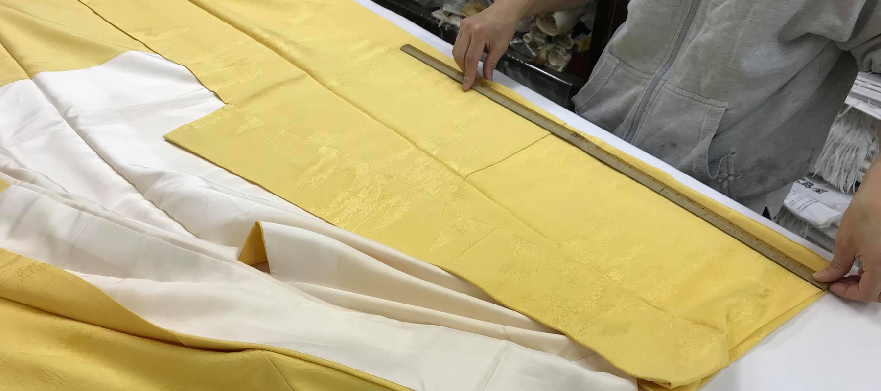 「ことごとく、すべて、残らず」を意味し、お客様や問屋からの注文を受けて意匠のアイデアを出したりさまざまな職人に指示を出しながら仕事を調整し、一枚の着物を仕上げていたプロデューサーを、かつては「悉皆屋」と呼んでいました。そのことから現在では一般的に、染め替え・洗い張り・幅だし・染め抜き・防水・入紋・仕立て直しなどきものメンテナンスんに関する一切を引き受ける仕事をさして悉皆と呼んでいます。