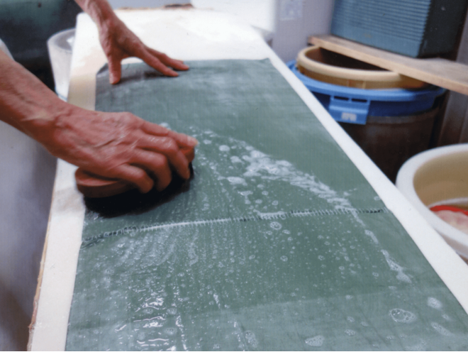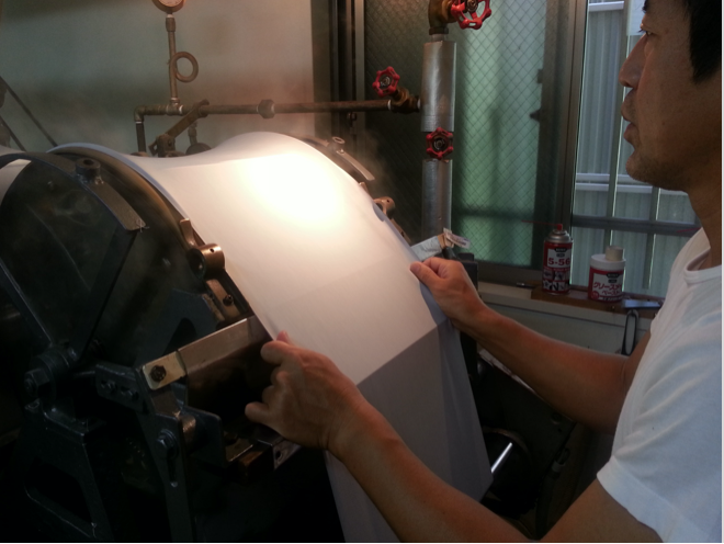 染める前の生地、染めあがった反物や洗張りした反物のしわ等を蒸気で伸ばし生地目をそろえることで、ピンとしたきれいな布に仕上げます。
