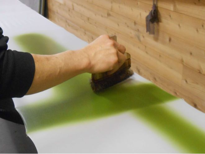 生地を引っ張りながら刷毛で一気に染めていきます。気象条件や気温・湿度によってむらが出来ることもあるため、難しい染め方でもあります。